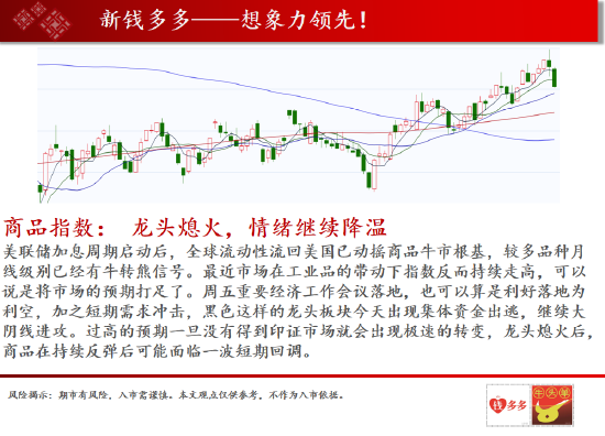 操作建议:美联储加息周期启动后,全球流动性流回美国已动摇商品牛市根基,较多品种月线级别已经有牛转熊信号。最近市场在工业品的带动下指数反而持续走高,可以说是将市场的预期打足了。周五重要经济工作会议落地,也可以算是利好落地为利空,加之短期需求冲击,黑色这样的龙头板块今天出现集体资金出逃,继续大阴线进攻。过高的预期一旦没有得到印证市场就会出现极速的转变,龙头熄火后,商品在持续反弹后可能面临一波短期回调。