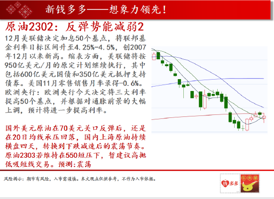 操作建议:国外美元原油在70美元关口反弹后,还是在20日均线承压回落,国内上海原油持续横盘四天,转换到下跌减速后的震荡节奏。原油2303若维持在550短压下,暂建议高抛低吸短线交易。预测:震荡