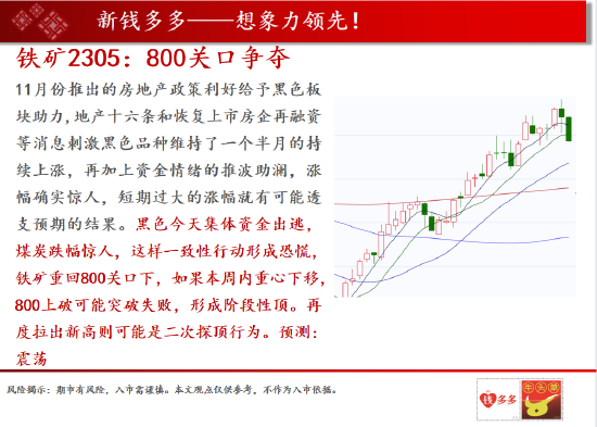 操作建议:黑色今天集体资金出逃,煤炭跌幅惊人,这样一致性行动形成恐慌,铁矿重回800关口下,如果本周内重心下移,800上破可能突破失败,形成阶段性顶。再度拉出新高则可能是二次探顶行为。预测:震荡。
