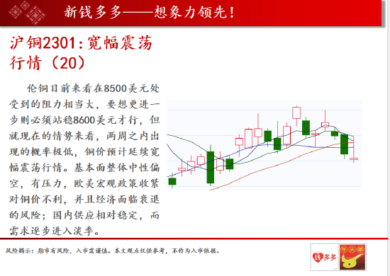 操作建议:伦铜目前来看在8500美元处受到的阻力相当大,要想更进一步则必须站稳8600美元才行,但就现在的情势来看,两周之内出现的概率极低,铜价预计延续宽幅震荡行情。