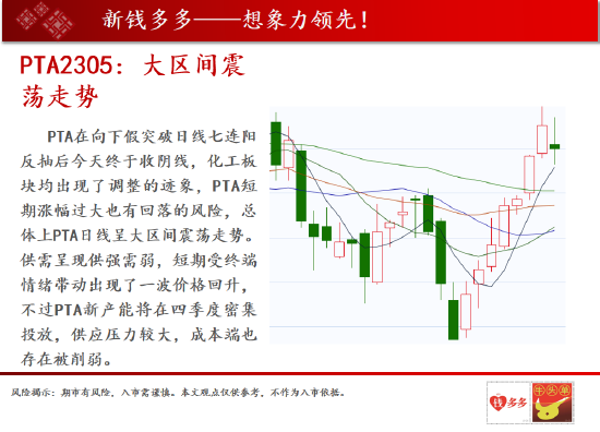 基本面概述:供需呈现供强需弱,短期受终端情绪带动出现了一波价格回升,不过PTA新产能将在四季度密集投放,供应压力较大,成本端也存在被削弱。