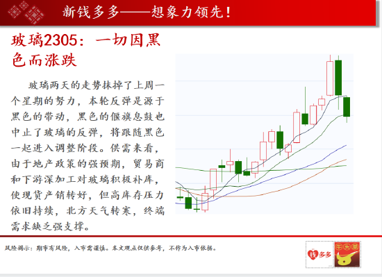 操作建议:玻璃两天的走势抹掉了上周一个星期的努力,本轮反弹是源于黑色的带动,黑色的偃旗息鼓也中止了玻璃的反弹,将跟随黑色一起进入调整阶段。