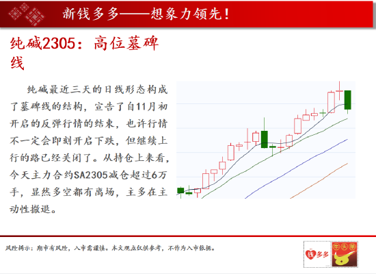 基本面概述:纯碱最近三天的日线形态构成了墓碑线的结构,宣告了自11月初开启的反弹行情的结束,也许行情不一定会即刻开启下跌,但继续上行的路已经关闭了。