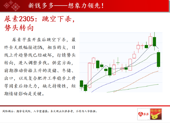 操作建议:尿素早盘开盘后跳空下杀,最终全天跌幅接近5%,相当的大,日线上升趋势线已经破坏,行情势头转向,进入调整步伐。