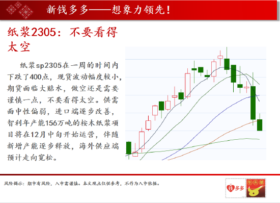 操作建议:纸浆sp2305在一周的时间内下跌了400点,现货波动幅度较小,期货面临大贴水,做空还是需要谨慎一点,不要看得太空。