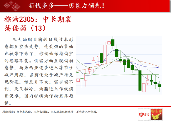 操作建议:三大油脂目前的日线技术形态都呈空头走势,连最强的菜油也被带下来了,棕榈油保持偏空的思路不变。