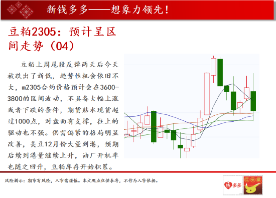 操作建议:豆粕上周尾段反弹两天后今天被跌出了新低,趋势性机会依旧不大,m2305合约价格预计会在3600-3800的区间波动,不具备大幅上涨或者下跌的条件,期货贴水现货超过1000点,对盘面有支撑,往上的驱动也不强。