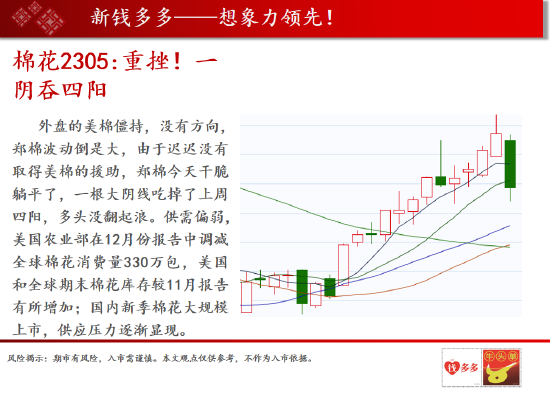 基本面概述:供需偏弱,美国农业部在12月份报告中调减全球棉花消费量330万包,美国和全球期末棉花库存较11月报告有所增加;国内新季棉花大规模上市,供应压力逐渐显现。