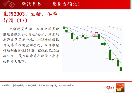 操作建议:LH03普遍被认为是季节性偏空的合约,今日继续领跌创出新低15410!猪粮比已经跌破6.50,或可认为是在延长上半年的价格大熊市。