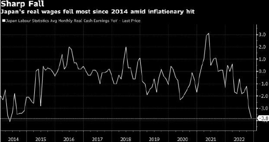 日本政府周五公布的数据显示,由于通胀率上升,日本11月份实际工资下降3.8%,为八年多来最大降幅,而名义工资尽管连续11个月增长,但增速有所放缓。