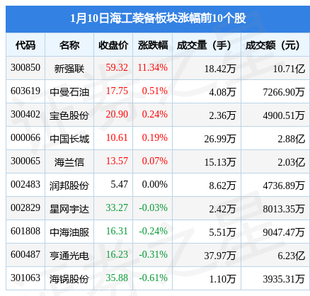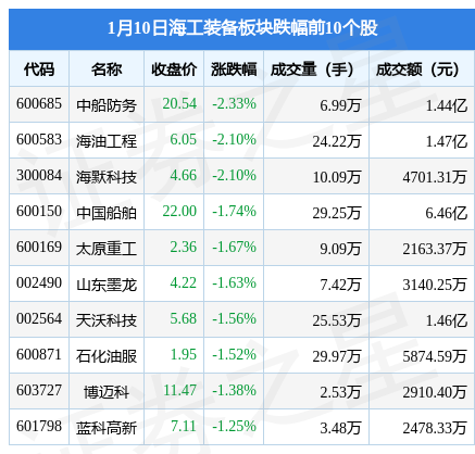 1月10日海工装备板块较上一交易日下跌0.66%,中船防务(600685)领跌。当日上证指数报收于3169.51,下跌0.21%。深证成指报收于11506.79,上涨0.49%。海工装备板块个股涨跌见下表: