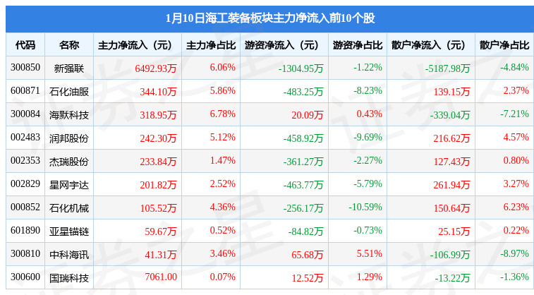 从资金流向上来看,当日海工装备板块主力资金净流出1.65亿元,游资资金净流出5074.01万元,散户资金净流入2.16亿元。海工装备板块个股资金流向见下表: