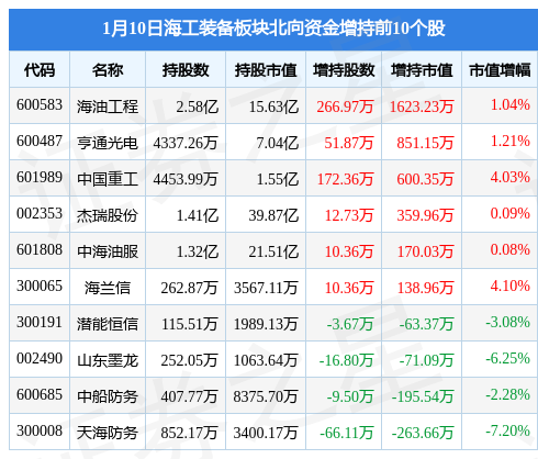 北向资金方面,当日海工装备板块北向资金持股市值为128.24亿元,减持0.96亿元。其中增持最多的是海油工程(600583),增持了0.16亿元。减持持最多的是新强联,减持了1.01亿元。海工装备板块北向资金持股变动明细见下表: