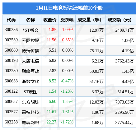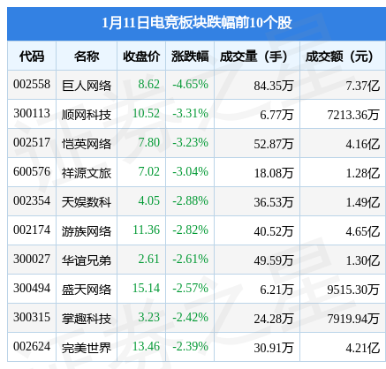 1月11日电竞板块较上一交易日下跌2.67%,巨人网络(002558)领跌。当日上证指数报收于3161.84,下跌0.24%。深证成指报收于11439.44,下跌0.59%。电竞板块个股涨跌见下表: