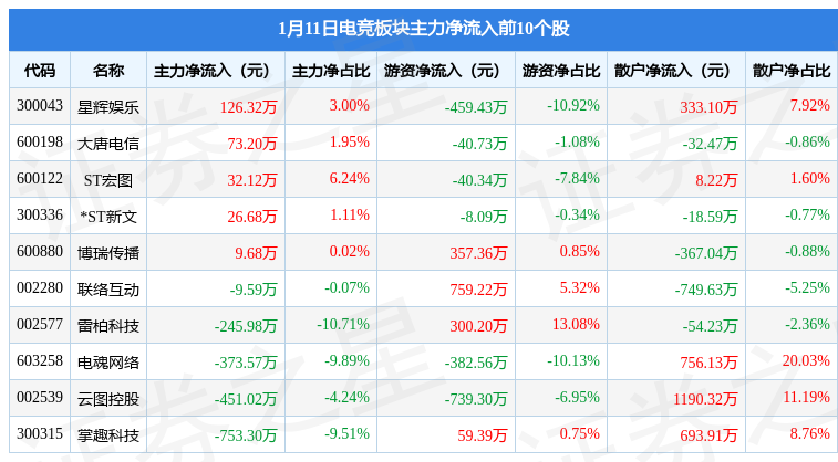 从资金流向上来看,当日电竞板块主力资金净流出4.28亿元,游资资金净流入5356.16万元,散户资金净流入3.75亿元。电竞板块个股资金流向见下表: