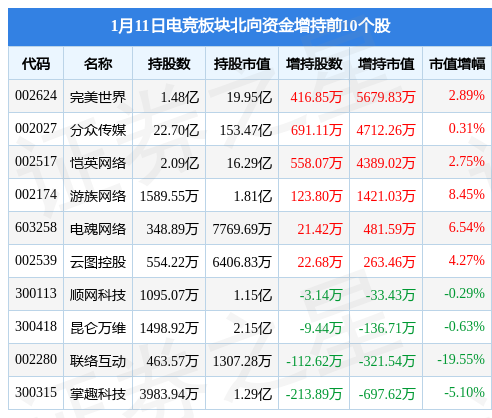 北向资金方面,当日电竞板块北向资金持股市值为200.06亿元,增持1.42亿元。其中增持最多的是完美世界(002624),增持了0.57亿元。减持持最多的是巨人网络,减持了0.15亿元。电竞板块北向资金持股变动明细见下表: