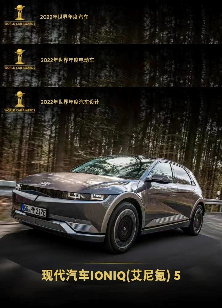 现代汽车IONIQ(艾尼氪) 5在“2022世界汽车大奖”评选中,一举包揽三项大奖