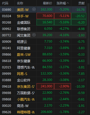 1月16日消息,港股恒生科技指数午后跌幅扩大至2%,美团、快手跌超5%,网易跌3.36%,京东跌2.9%,哔哩哔哩跌1.78%。
