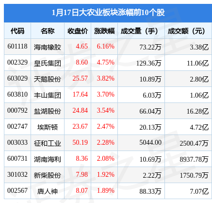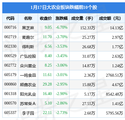 1月17日大农业板块较上一交易日下跌0.08%,黑芝麻(000716)领跌。当日上证指数报收于3224.24,下跌0.1%。深证成指报收于11800.55,上涨0.13%。大农业板块个股涨跌见下表: