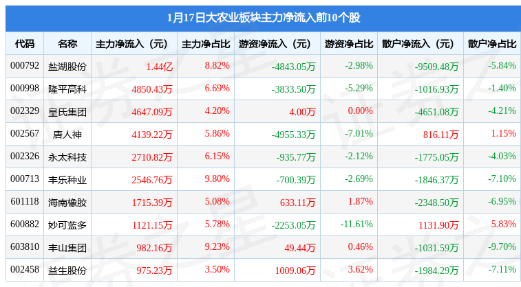 从资金流向上来看,当日大农业板块主力资金净流出5.48亿元,游资资金净流出2.6亿元,散户资金净流入8.08亿元。大农业板块个股资金流向见下表: