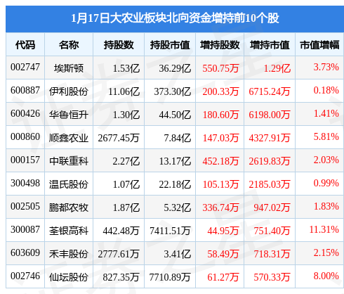北向资金方面,当日大农业板块北向资金持股市值为879.7亿元,减持523.8万元。其中增持最多的是埃斯顿(002747),增持了1.29亿元。减持持最多的是盐湖股份,减持了0.66亿元。大农业板块北向资金持股变动明细见下表:
