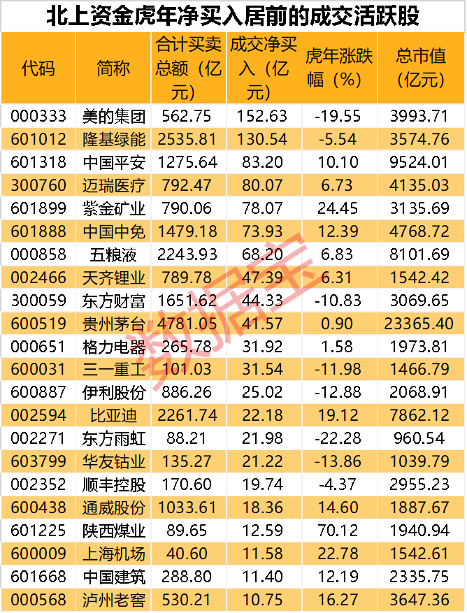 按农历来看,北上资金虎年净流入达到1857.76亿元,其中1154.33亿元为腊月净流入。北上资金在虎年买入了哪些白马股?