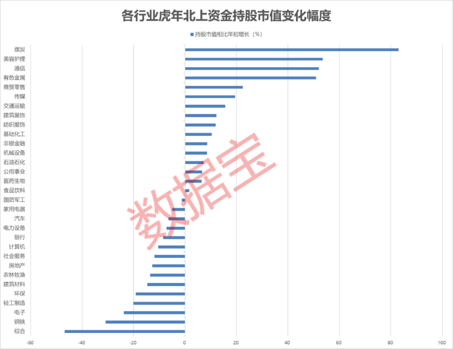 虎年全年,A股最耀眼的行业非煤炭莫属,煤炭指数全年大涨22.97%,在全部行业中排行首位。北上资金对煤炭行业青睐有加,持股量相对年初增长了27.64%,持股市值增长超过160亿元,增幅达到82.95%。