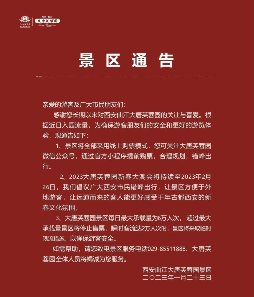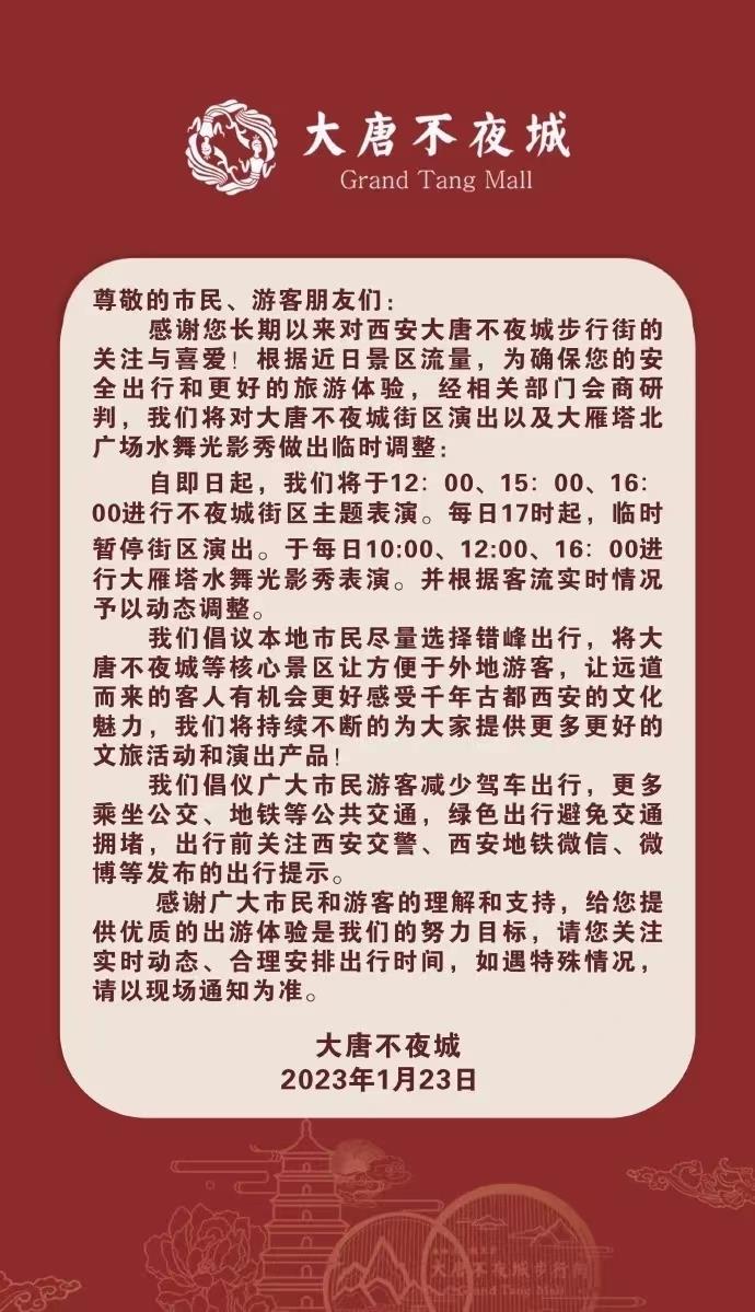 据央视新闻,为确保游客的安全和良好的游览体验,1月23日起,西安城墙景区、大唐不夜城、大唐芙蓉园等多个景点采取临时限流措施或演出时间调整措施。各景区还倡导本地市民尽量选择错峰出行,让远道而来的客人有机会更好感受西安的魅力。