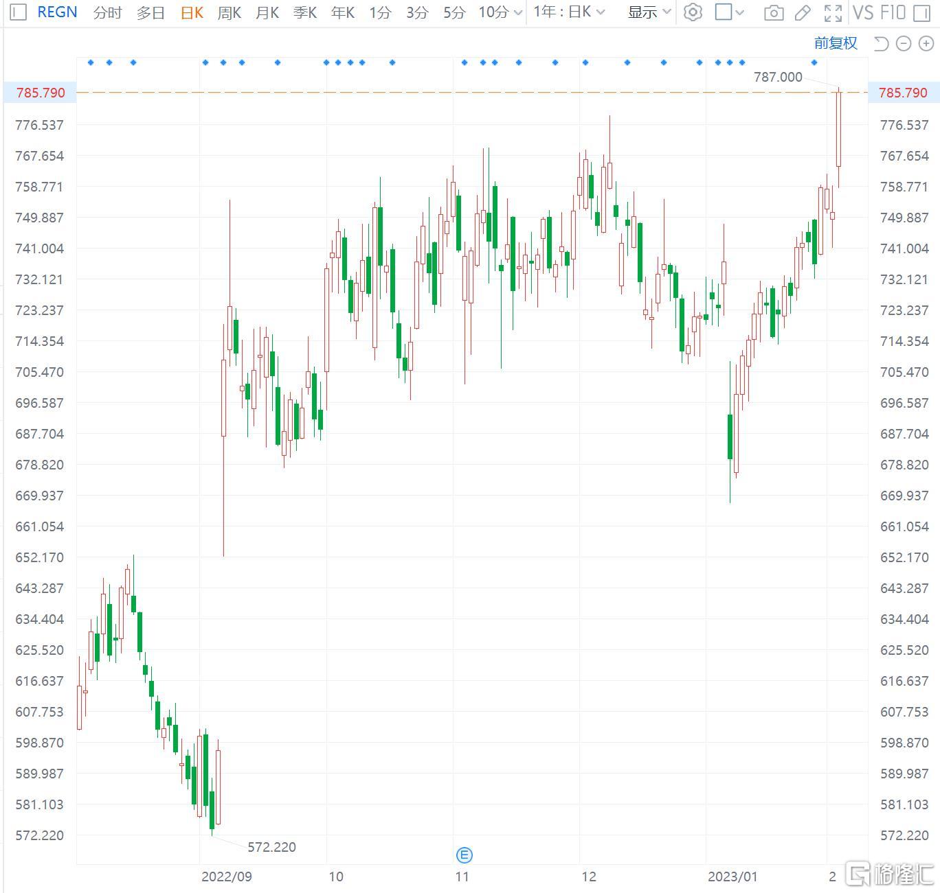 格隆汇2月3日丨再生元制药(REGN.US)涨4.35%,报783.84美元,总市值854亿美元。再生元制药2022年Q4实现营收34.14亿美元,前值为49.52亿美元,预期值为31.3亿美元,超出市场预期9.07%;每股收益为12.56美元,前值为23.42美元,预期值为10.03美元,超出市场预期25.22%。