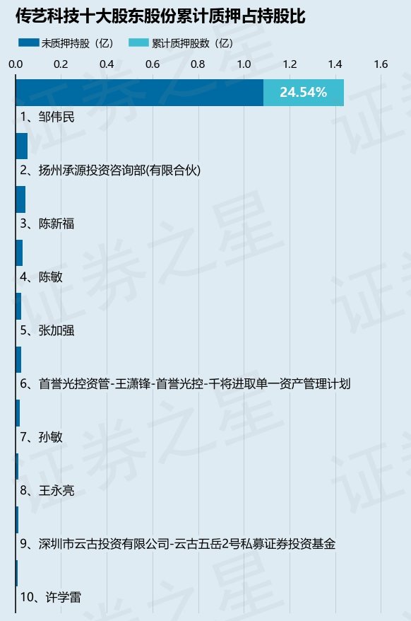 截止本公告日,股东邹伟民已累计质押股份3530.0万股,占其持股总数的24.54%。本次质押后传艺科技(002866)十大股东的累计质押股份占持股比例见下图: