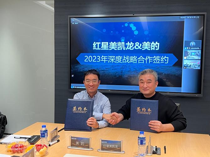 图:美的集团副总裁兼中国区域总裁柏林、红星美凯龙家居集团执行总裁兼大营运中心总经理朱家桂进行2023战略合作签约