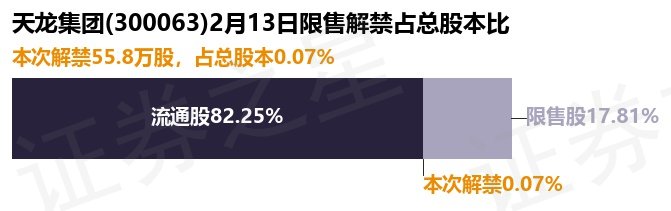根据市场公开信息整理,天龙集团(300063)(300063)于2月13日将有55.8万股限售股份解禁上市,为公司股权激励一般股份,占公司总股本0.07%。最近一年内,该股累计解禁812.7万股,占总股本的1.08%。本次解禁后,公司还有1.34亿股限售股份,占总股本17.81%。具体如下图所示: