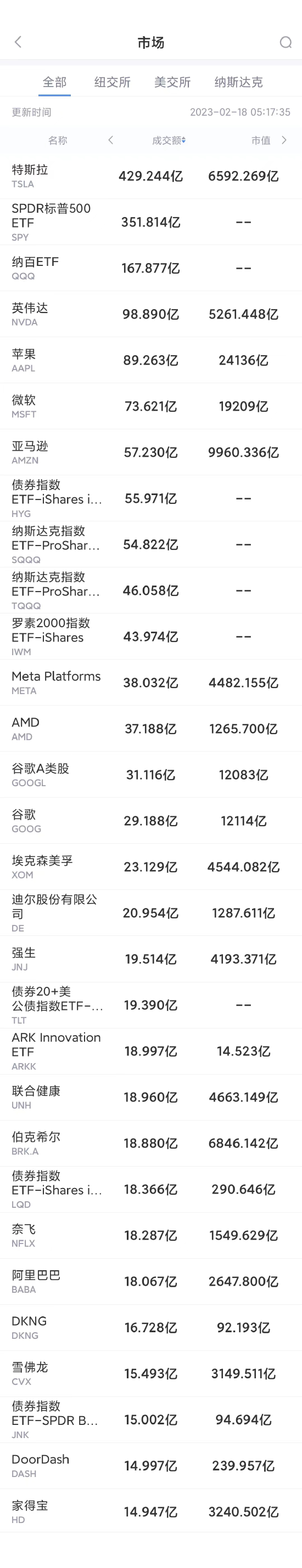 第4名微软收高1.56%,成交73.6亿美元。据称微软已经开始与广告公司讨论如何从其接入生成性人工智能服务的必应搜索引擎中获利。