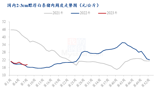 第7周,白条周均价在18.26元/公斤,较上周微涨0.38元/公斤,环比涨幅在2.13%,同比涨幅在10.60%。近期,各地区企业复工、学校开学,逐渐恢复正常节奏,且南方鲜销市场逐渐回暖,需求略有好转,本周随二次育肥入场,毛猪价格偏强运行,白条价格被动跟涨,但下游走货提升有限,预计下周白条价格窄幅震荡。