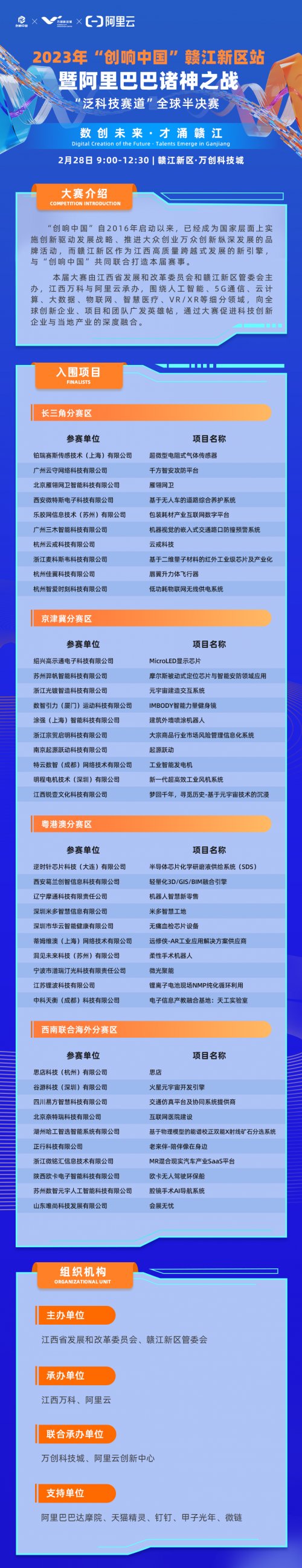 “创响中国”自2016年启动以来,历经7年已成为国家层面实施创新驱动发展战略、推动大众创业、万众创新、纵深发展的品牌活动。本次2023年“创响中国”赣江新区站暨第四届万创峰会暨阿里巴巴诸神之战“泛科技赛道”全球创新创业大赛,旨在以赛事带动产业,抢抓科技创新机遇。此前已圆满举办长三角、京津冀、粤港澳、西南联合海外四大分赛赛事,备受期待的全球半决赛及总决赛将分别于2023年2月28号、3月1号两日于江西赣江新区举行,来自全球的40强团队齐聚赣江新区,共同角逐最终桂冠!