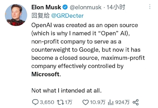 新浪科技讯 北京时间2月18日早间消息,特斯拉CEO埃隆·马斯克在社交平台上与网友互动时表示,OpenAI是作为一家开源、非盈利公司创建的,所以名字里面才带“Open”,目标就是制衡谷歌。但它现在成了一家由微软控制的闭源、追求利润最大化的公司,这与马斯克的初衷背道而驰。