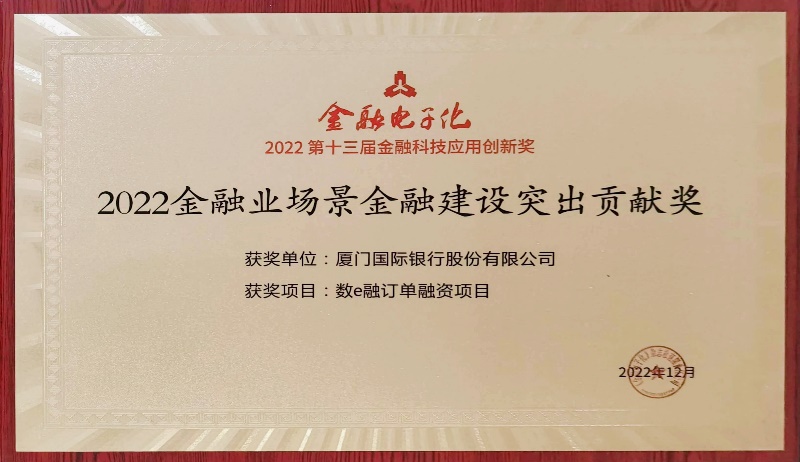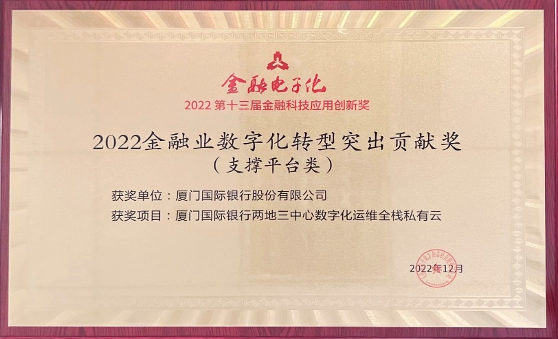 近日,由《金融电子化》杂志社主办的第十三届金融科技应用创新奖评选结果公布。厦门国际银行“两地三中心数字化运维全栈私有云”和“数e融订单融资”两个项目从398个申报项目中脱颖而出,分别荣获“2022金融业数字化转型突出贡献奖”和“2022金融业场景金融突出贡献奖”,充分体现了评委专家及企业公众对厦门国际银行项目先进性、创新性、推动数字化转型及提升服务能力、社会及经济效益的认可。