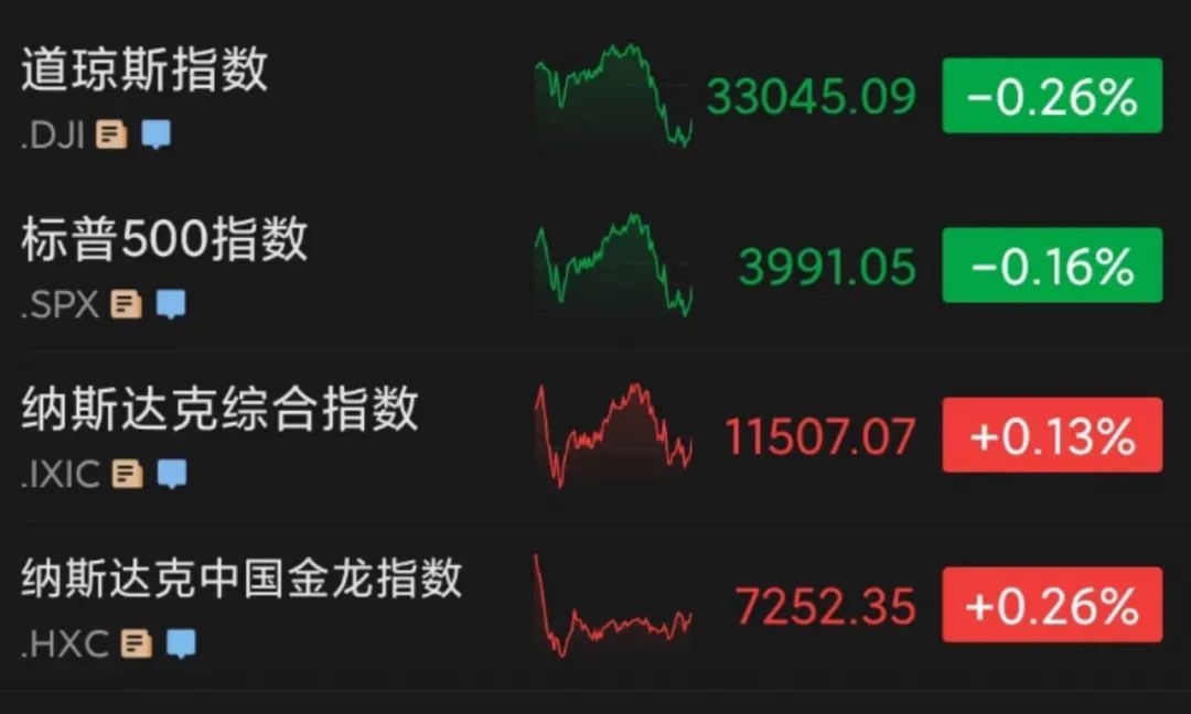 截至收盘,道指跌0.26%,报收33045.09点;纳指涨0.13%,收于11507.07点;标普500指数跌0.16%,报收3991.05点,录得“四连跌”。