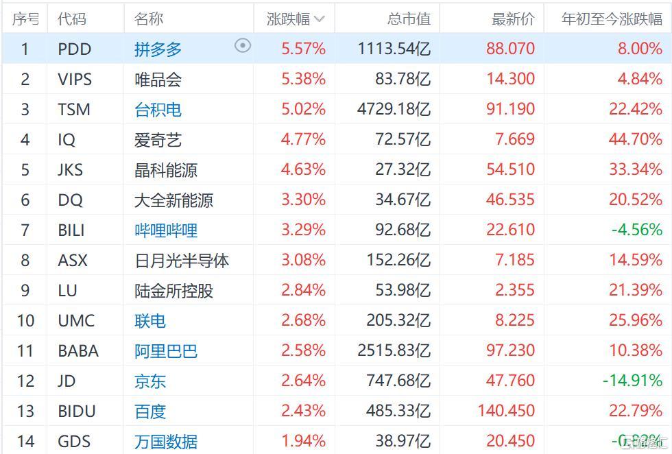 格隆汇2月23日丨纳斯达克中国金龙指数涨1.6%,拼多多、唯品会涨5%,爱奇艺、晶科能源涨4%,哔哩哔哩涨3%,阿里巴巴、联电、京东、百度涨2%。