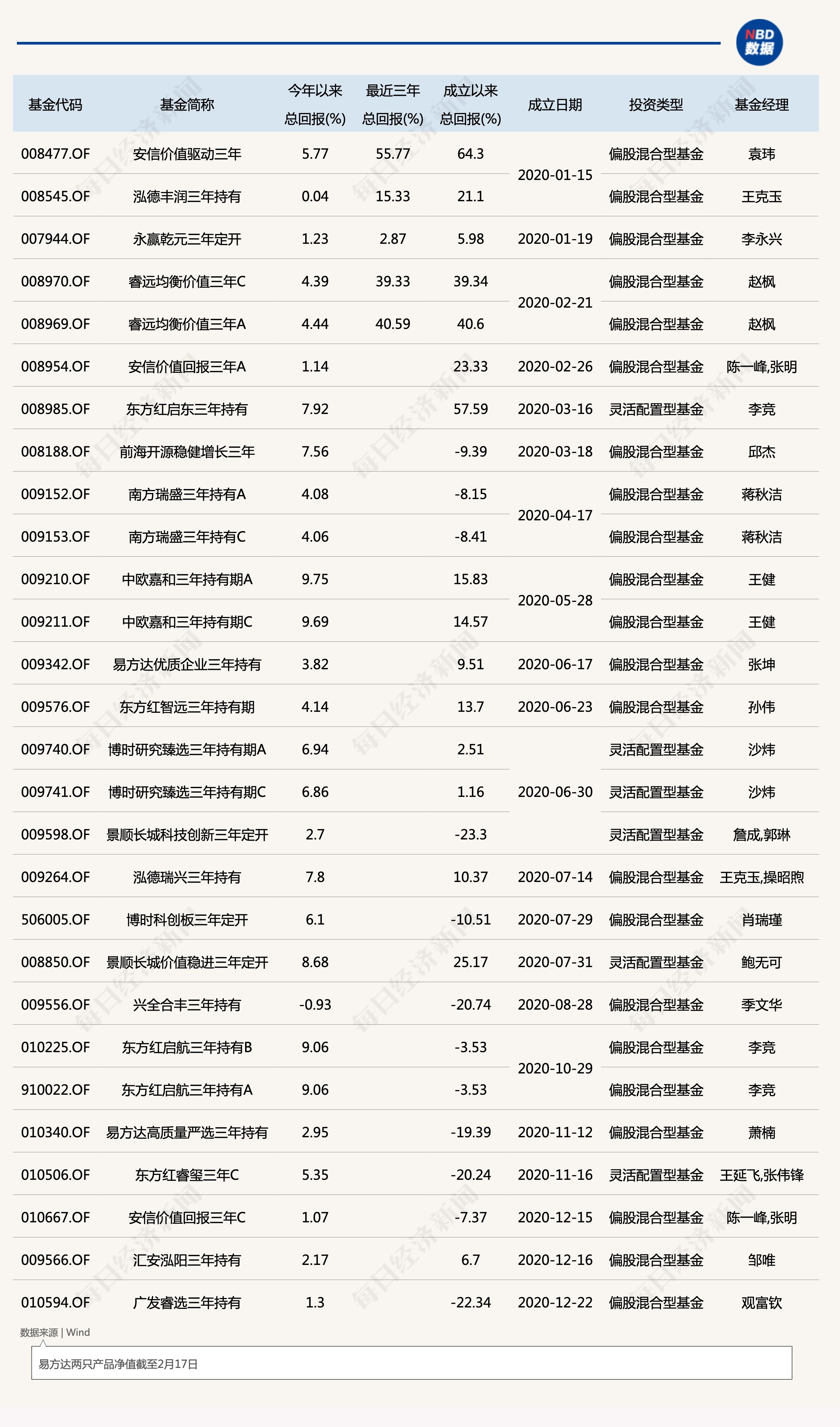 Wind数据显示,在下列28只2020年成立的三年期基金中,有12只基金自成立以来还是亏损的,有17只基金成立以来的收益低于10%。显然,如果持有这些基金截至目前,竟然有超40%的概率出现亏损。
