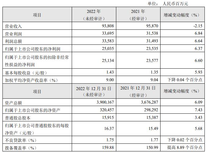 2月23日,华夏银行(600015)发布2022年度业绩快报显示,报告期内,该行实现营业收入938.08亿元,同比减少2.15%;归属于上市公司股东的净利润250.35亿元,同比增加6.37%。