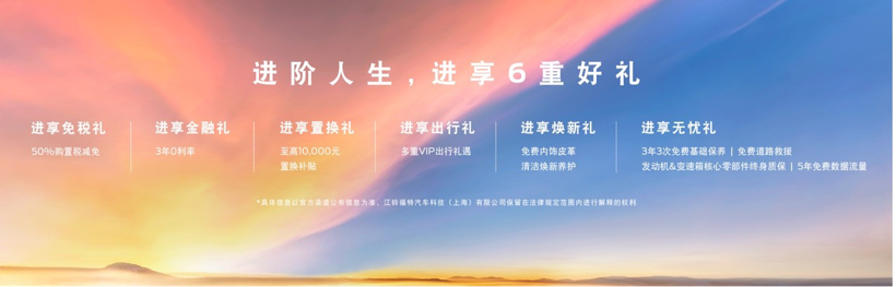 为回馈广大用户的支持与厚爱,福特新领裕携六重豪礼强势来袭。用户购车即享:进享免税礼(50%购置税减免)、进享金融礼(3年0利率)、进享置换礼(至高10,000元置换补贴)、进享出行礼(多重VIP出行礼遇)、进享焕新礼(免费内饰皮革清洁焕新养护)、进享无忧礼(3年3次免费基础保养、免费道路救援、发动机&变速箱核心零部件终身质保及5年免费数据流量)。欢迎通过“福特体验店”小程序、“江铃福特科技”官方微信公众号等渠道了解车型信息和购车详情。