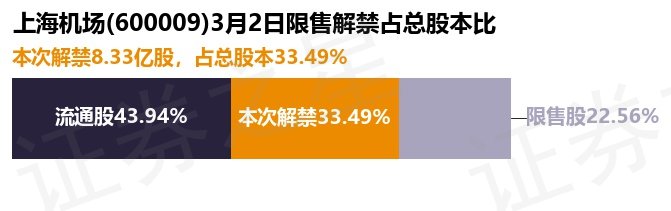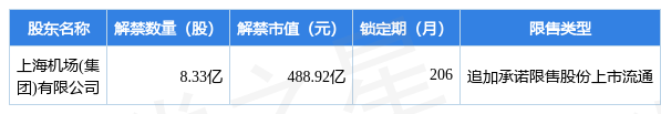 根据市场公开信息整理,上海机场(600009)(600009)于3月2日将有8.33亿股限售股份解禁上市,为公司追加承诺限售股份上市流通,占公司总股本33.49%。本次解禁后,公司还有5.62亿股限售股份,占总股本22.56%。具体如下图所示: