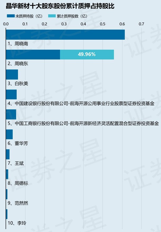 截止本公告日,股东周晓东已累计质押股份2790.0万股,占其持股总数的49.96%。本次质押后晶华新材(603683)十大股东的累计质押股份占持股比例见下图: