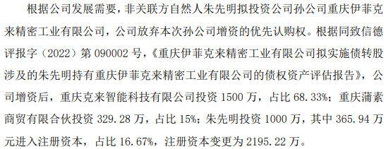 挖贝网3月3日,金沙数控(832882)近日发布公告,根据公司发展需要,非关联方自然人朱先明拟投资公司孙公司重庆伊菲克来精密工业有限公司,公司放弃本次孙公司增资的优先认购权。根据同致信德评报字(2022)第090002号,《重庆伊菲克来精密工业有限公司拟实施债转股涉及的朱先明持有重庆伊菲克来精密工业有限公司的债权资产评估报告》,公司增资后,重庆克来智能科技有限公司投资1500万,占比68.33%;重庆蒲素商贸有限合伙投资329.28万,占比15%;朱先明投资1000万,其中365.94万元进入注册资本,占比16.67%,注册资本变更为2195.22万。