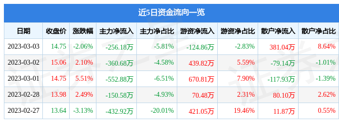 3月3日的资金流向数据方面,主力资金净流出256.18万元,占总成交额5.81%,游资资金净流出124.86万元,占总成交额2.83%,散户资金净流入381.04万元,占总成交额8.64%。