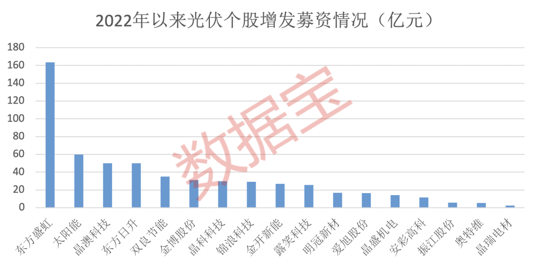 光伏高景气度,可以从近年来的增发募资规模来看,2020年以来A股光伏项目合计定增募资逾1250亿,其中2022年以来募资金额573.74亿元,仅东方盛虹一家就达163.6亿元。