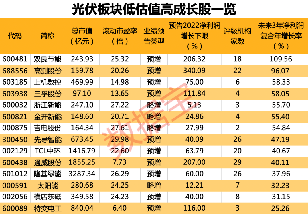 估值方面,板块平均滚动市盈率仅24.77倍,处于历史分位点4.12%。数据宝统计,多只业绩预喜股市盈率不足30倍,其中高测股份20.26倍,上机数控14.9倍,通威股份仅7.73倍。