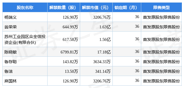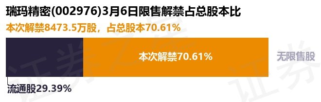 根据市场公开信息整理,瑞玛精密(002976)于3月6日将有8473.5万股限售股份解禁上市,为公司首发原股东限售股份,占公司总股本70.61%。本次解禁后,公司已无限售股份。具体如下图所示: