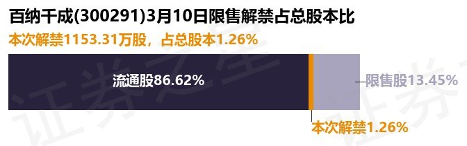 根据市场公开信息整理,百纳千成(300291)于3月10日将有1153.31万股限售股份解禁上市,为公司股权激励一般股份,占公司总股本1.26%。最近一年内,该股累计解禁3235.25万股,占总股本的3.52%。本次解禁后,公司还有1.24亿股限售股份,占总股本13.45%。具体如下图所示: